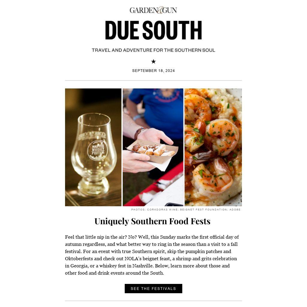 Feel that little nip in the air? No? Well, this Sunday marks the first official day of autumn regardless, and what better way to ring in the season than a visit to a fall festival. For an event with true Southern spirit, skip the pumpkin patches and Oktoberfests and check out NOLA’s beignet feast, a shrimp and grits celebration in Georgia, or a whiskey fest in Nashville. Below, learn more about those and other food and drink events around the South.