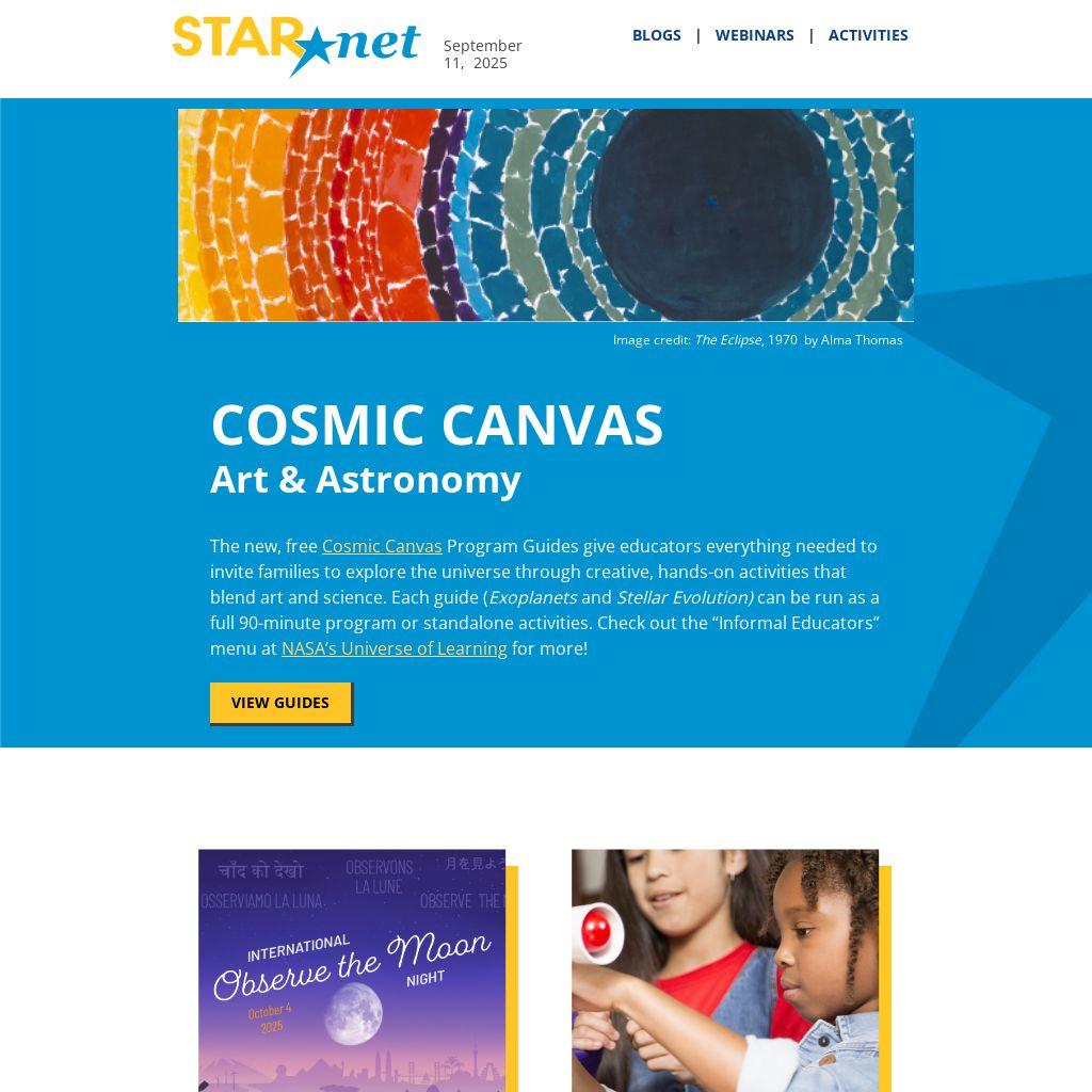 The new, free Cosmic Canvas Program Guides give educators everything needed to invite families to explore the universe through creative, hands-on activities that blend art and science. Each guide (Exoplanets and Stellar Evolution) can be run as a full 90-minute program or standalone activities. Check out the “Informal Educators” menu at NASA’s Universe of Learning for more!