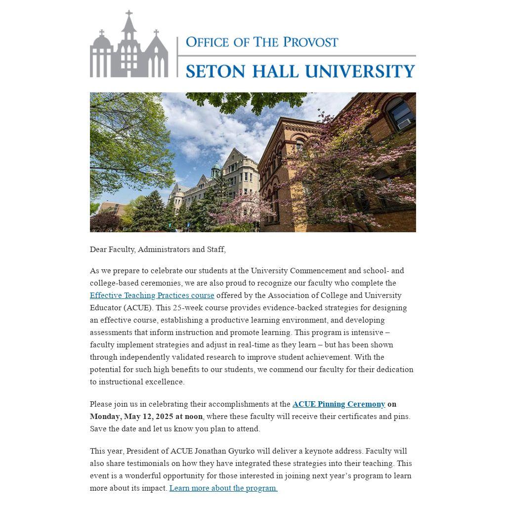 As we prepare to celebrate our students at the University Commencement and school- and college-based ceremonies, we are also proud to recognize our faculty who complete the Effective Teaching Practices course offered by the Association of College and University Educator (ACUE). This 25-week course provides evidence-backed strategies for designing an effective course, establishing a productive learning environment, and developing assessments that inform instruction and promote learning. This program is intensive – faculty implement strategies and adjust in real-time as they learn – but has been shown through independently validated research to improve student achievement. With the potential for such high benefits to our students, we commend our faculty for their dedication to instructional excellence.