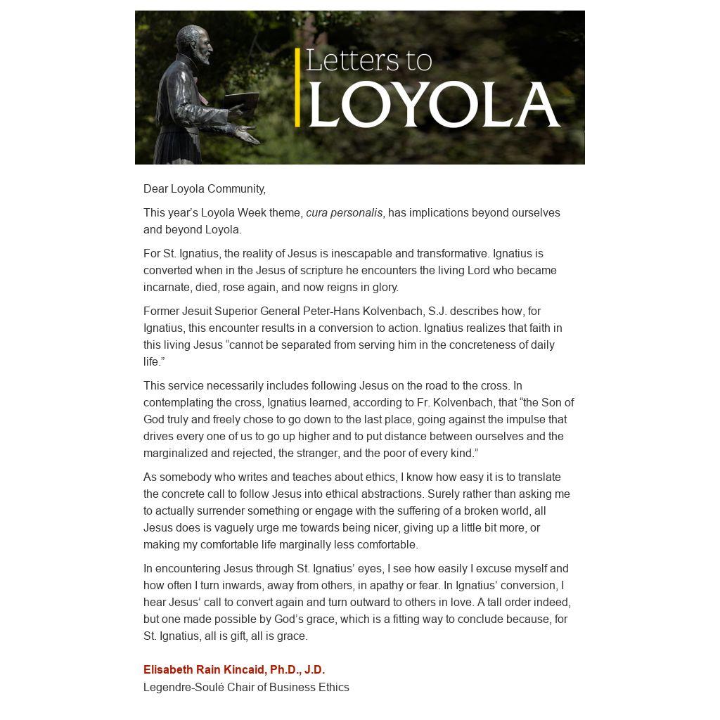 This year’s Loyola Week theme, cura personalis, has implications beyond ourselves and beyond Loyola.