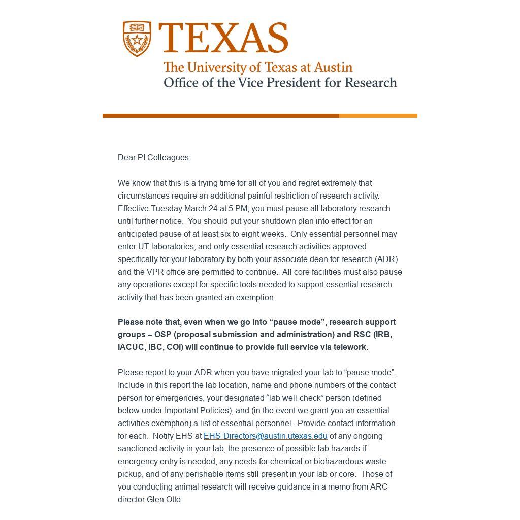 We know that this is a trying time for all of you and regret extremely that circumstances require an additional painful restriction of research activity. Effective Tuesday March 24 at 5 PM, you must pause all laboratory research until further notice. You should put your shutdown plan into effect for an anticipated pause of at least six to eight weeks. Only essential personnel may enter UT laboratories, and only essential research activities approved specifically for your laboratory by both your associate dean for research (ADR) and the VPR office are permitted to continue. All core facilities must also pause any operations except for specific tools needed to support essential research activity that has been granted an exemption.