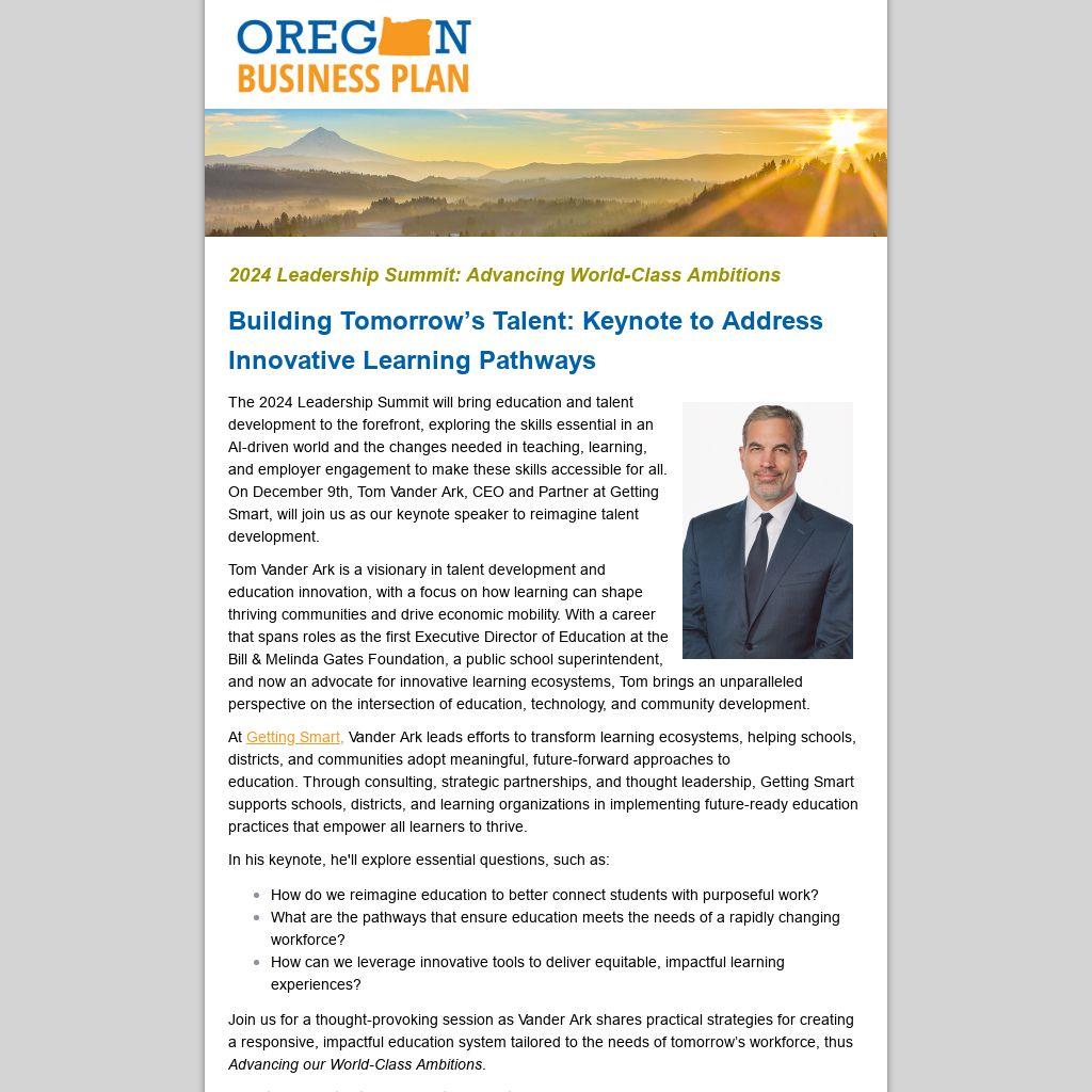 The 2024 Leadership Summit will bring education and talent development to the forefront, exploring the skills essential in an AI-driven world and the changes needed in teaching, learning, and employer engagement to make these skills accessible for all. On December 9th, Tom Vander Ark, CEO and Partner at Getting Smart, will join us as our keynote speaker to reimagine talent development.