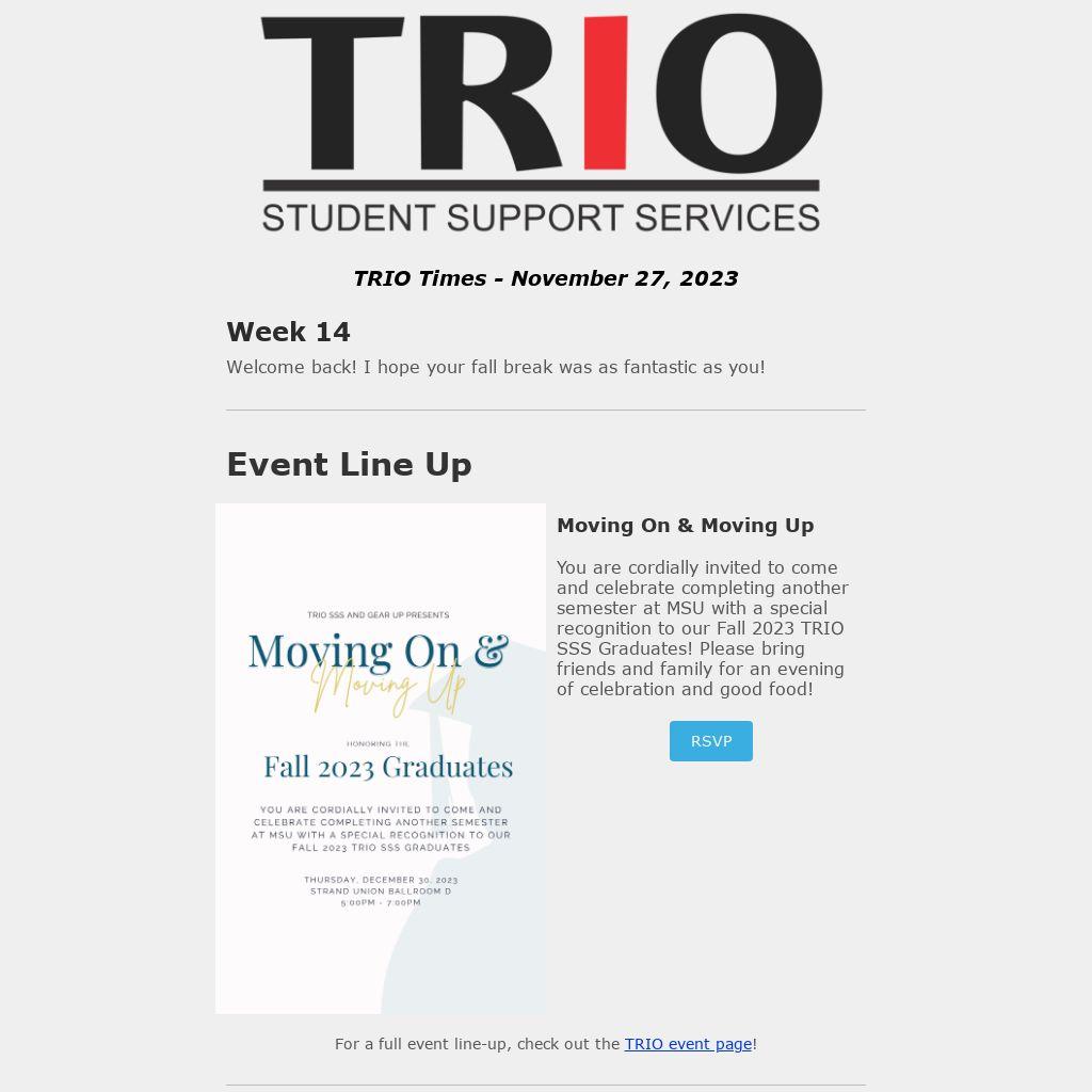 You are cordially invited to come and celebrate completing another semester at MSU with a special recognition to our Fall 2023 TRIO SSS Graduates! Please bring friends and family for an evening of celebration and good food!