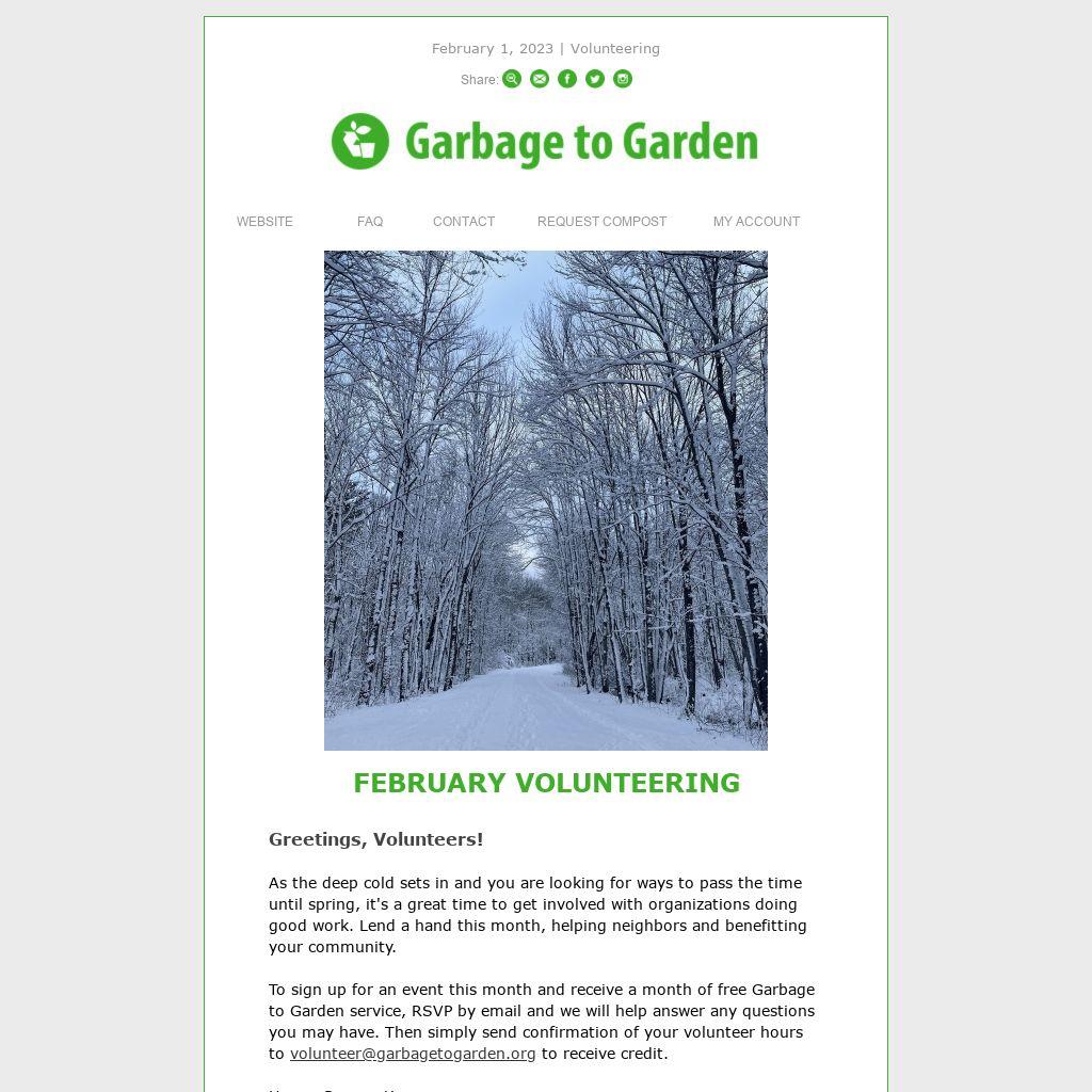 To sign up for an event this month and receive a month of free Garbage to Garden service, RSVP by email and we will help answer any questions you may have. Then simply send confirmation of your volunteer hours to volunteer@garbagetogarden.org to receive credit.