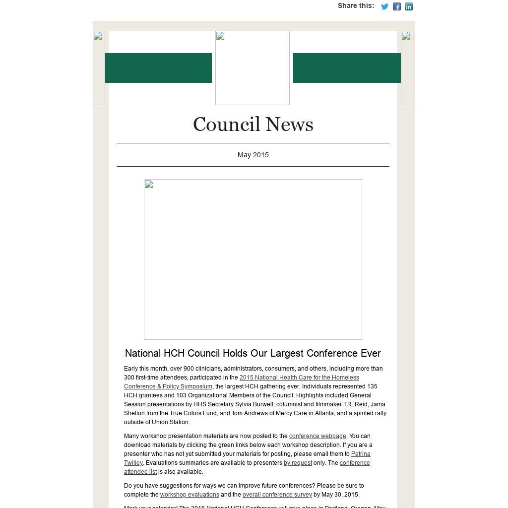 Early this month, over 900 clinicians, administrators, consumers, and others, including more than 300 first-time attendees, participated in the 2015 National Health Care for the Homeless Conference & Policy Symposium, the largest HCH gathering ever. Individuals represented 135 HCH grantees and 103 Organizational Members of the Council. Highlights included General Session presentations by HHS Secretary Sylvia Burwell, columnist and filmmaker T.R. Reid, Jama Shelton from the True Colors Fund, and Tom Andrews of Mercy Care in Atlanta, and a spirited rally outside of Union Station. Many workshop presentation materials are now posted to the conference webpage. You can download materials by clicking the green links below each workshop description. If you are a presenter who has not yet submitted your materials for posting, please email them to Patrina Twilley. Evaluations summaries are available to presenters by request only. The conference attendee list is also available. Mark your calendar! The 2016 National HCH Conference will take place in Portland, Oregon, May 31-June 3.