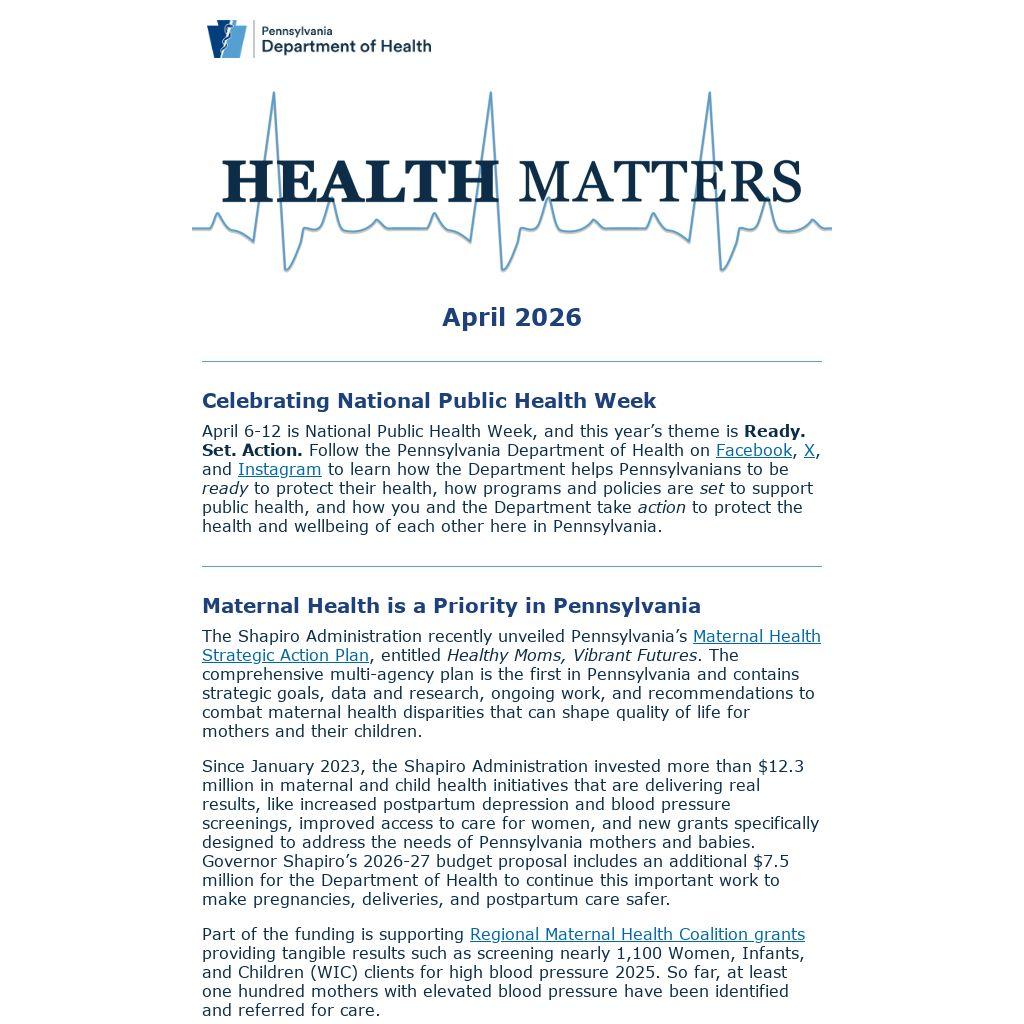 If this edition of Health Matters was forwarded to you by a friend, sign up here to get monthly public health information, news, and updates from the Pennsylvania Department of Health delivered directly to your inbox.