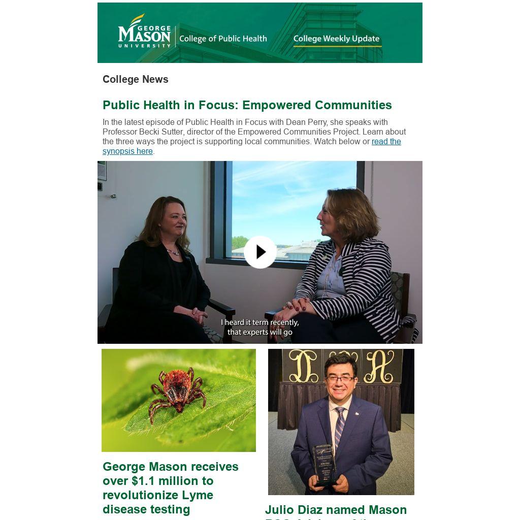 Do you have a suggestion for a terrific "Deans Speaker"? We sponsor the travel of these esteemed colleagues who share their exciting research and experiences with CPH faculty and students. I'm eager to hear your suggestions. Please send them to me at aevanscu@gmu.edu.