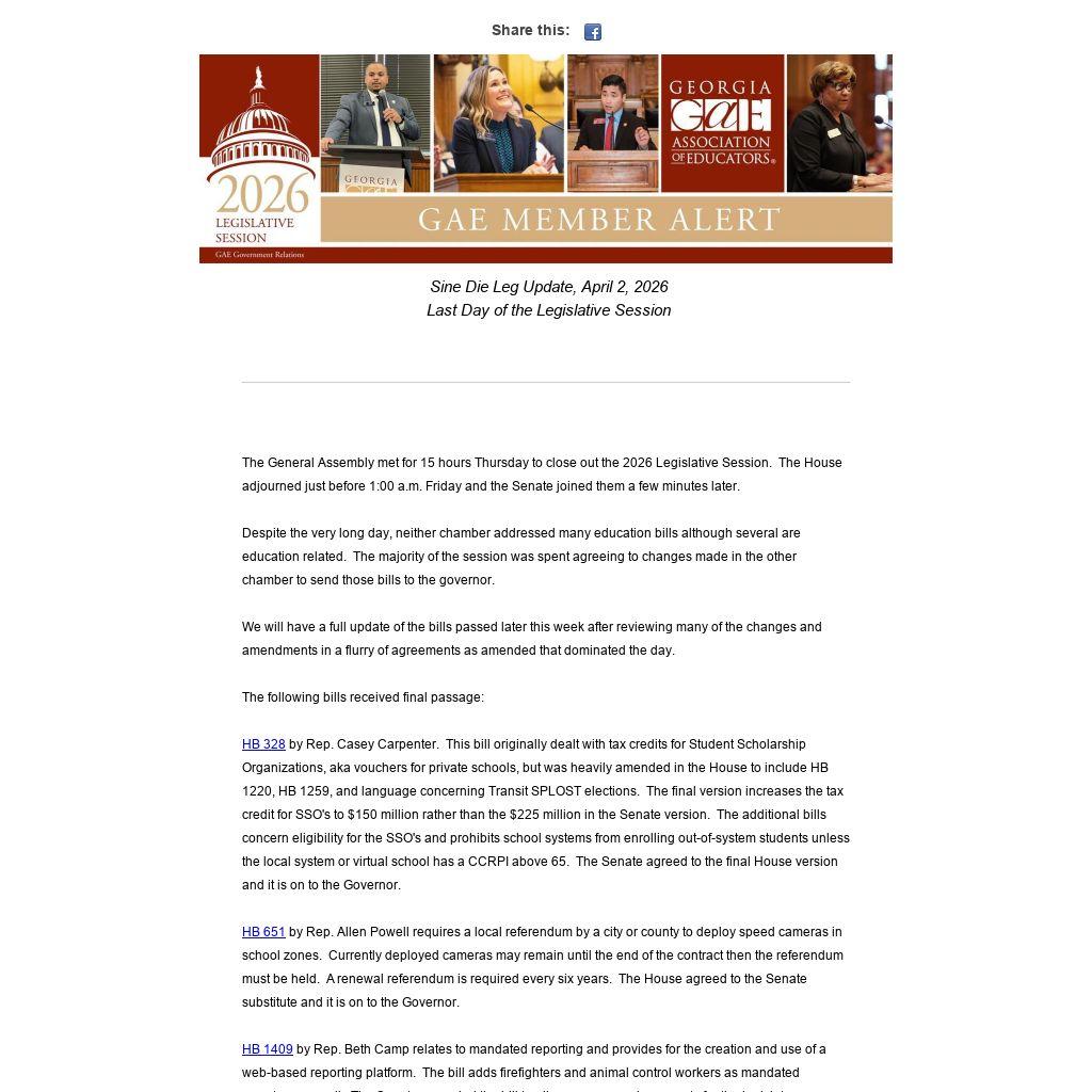 HB 328 by Rep. Casey Carpenter. This bill originally dealt with tax credits for Student Scholarship Organizations, aka vouchers for private schools, but was heavily amended in the House to include HB 1220, HB 1259, and language concerning Transit SPLOST elections. The final version increases the tax credit for SSO's to $150 million rather than the $225 million in the Senate version. The additional bills concern eligibility for the SSO's and prohibits school systems from enrolling out-of-system students unless the local system or virtual school has a CCRPI above 65. The Senate agreed to the final House version and it is on to the Governor.