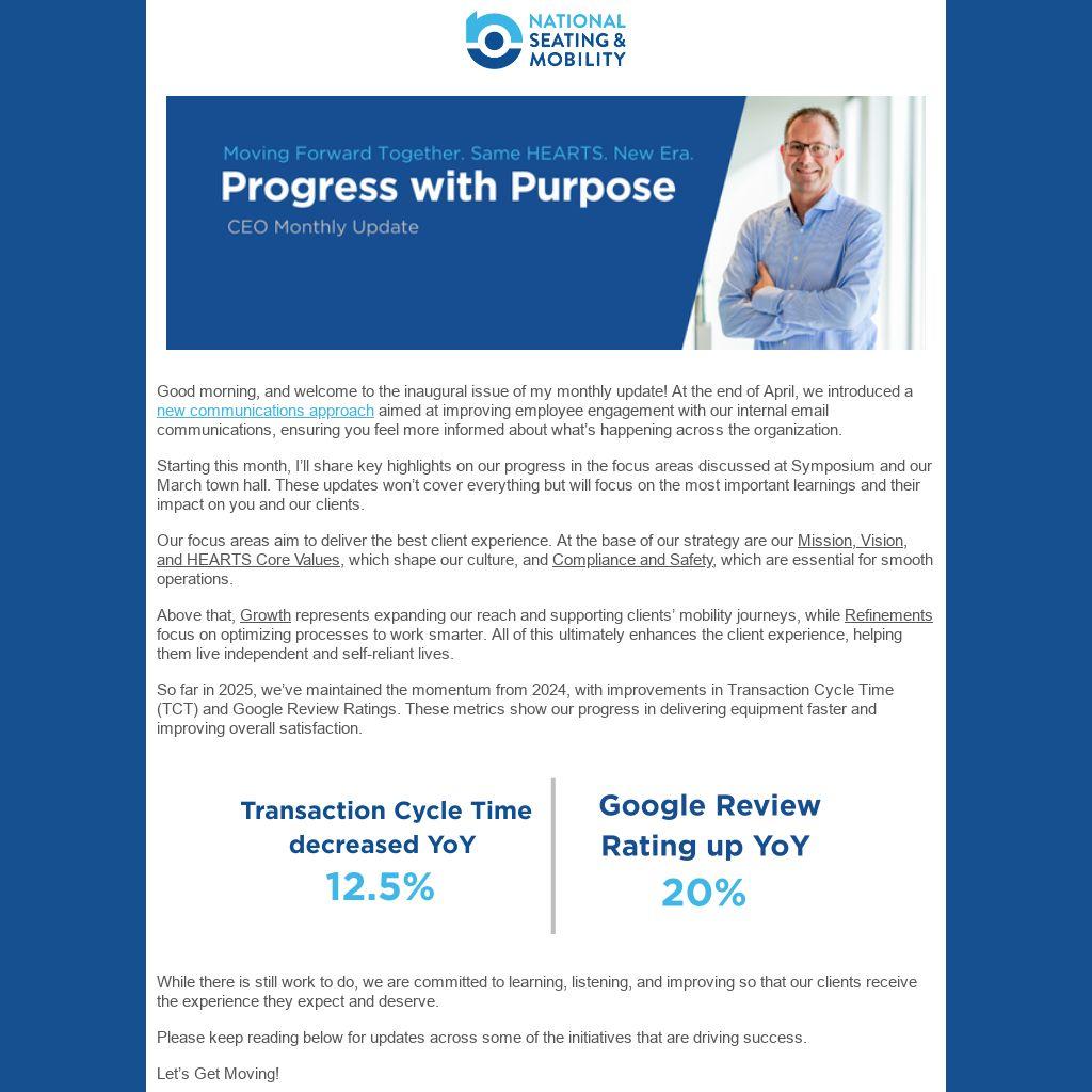 Good morning, and welcome to the inaugural issue of my monthly update! At the end of April, we introduced a new communications approach aimed at improving employee engagement with our internal email communications, ensuring you feel more informed about what’s happening across the organization.