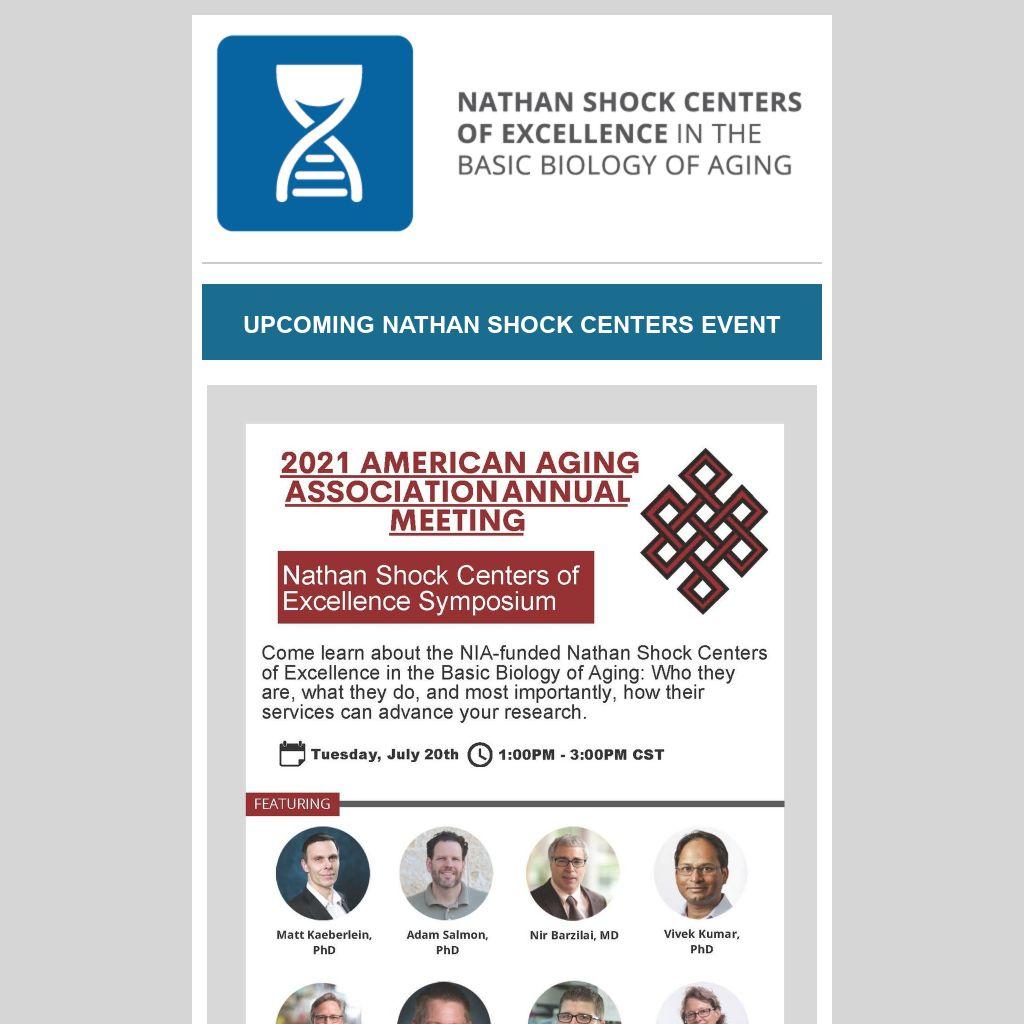 This newsletter is produced by the American Federation for Aging Research, which serves as the Coordinating Center of the Nathan Shock Centers of Excellence in the Basic Biology of Aging. The Nathan Shock Centers program is funded by the National Institutes of Health National Institute of Aging. Research reported in this publication was supported by the National Institute on Aging of the National Institutes of Health under Award Number U24AG056053. The content is solely the responsibility of the authors and does not necessarily represent the official views of the National Institutes of Health.