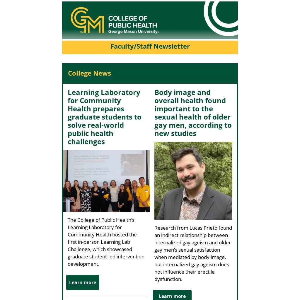 This week you may notice a new look to the newsletter. We're trying out a new template with the new branding. The newsletter may change some throughout the summer. Like something about it? Find it difficult to read? Please provide feedback to mcunni7@gmu.edu. Thanks!