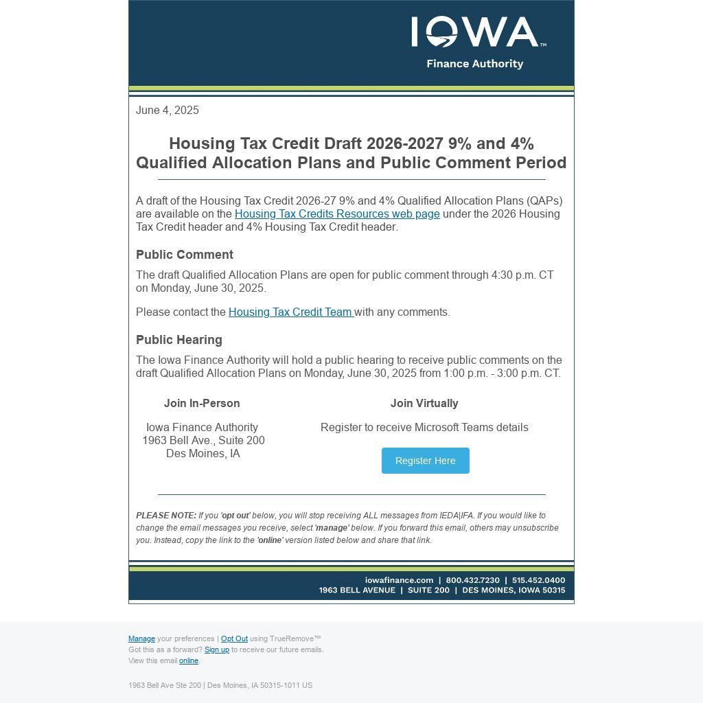 The Iowa Finance Authority will hold a public hearing to receive public comments on the draft Qualified Allocation Plans on Monday, June 30, 2025 from 1:00 p.m. - 3:00 p.m. CT.