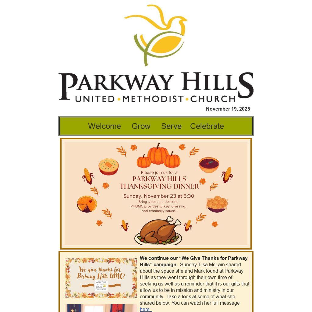 We continue our “We Give Thanks for Parkway Hills” campaign. Sunday, Lisa McLain shared about the space she and Mark found at Parkway Hills as they went through their own time of seeking as well as a reminder that it is our gifts that allow us to be in mission and ministry in our community. Take a look at some of what she shared below. You can watch her full message here.