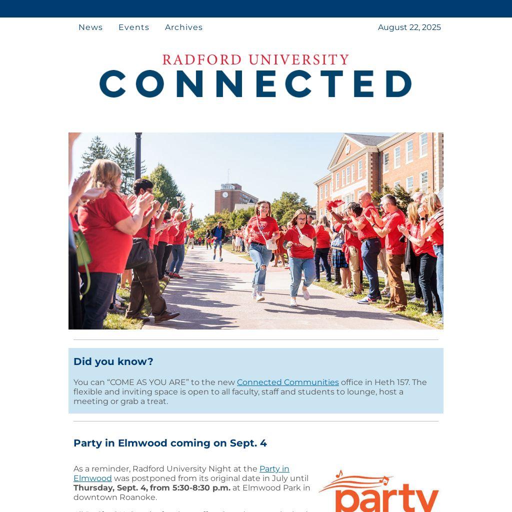 As a reminder, Radford University Night at the Party in Elmwood was postponed from its original date in July until Thursday, Sept. 4, from 5:30-8:30 p.m. at Elmwood Park in downtown Roanoke.