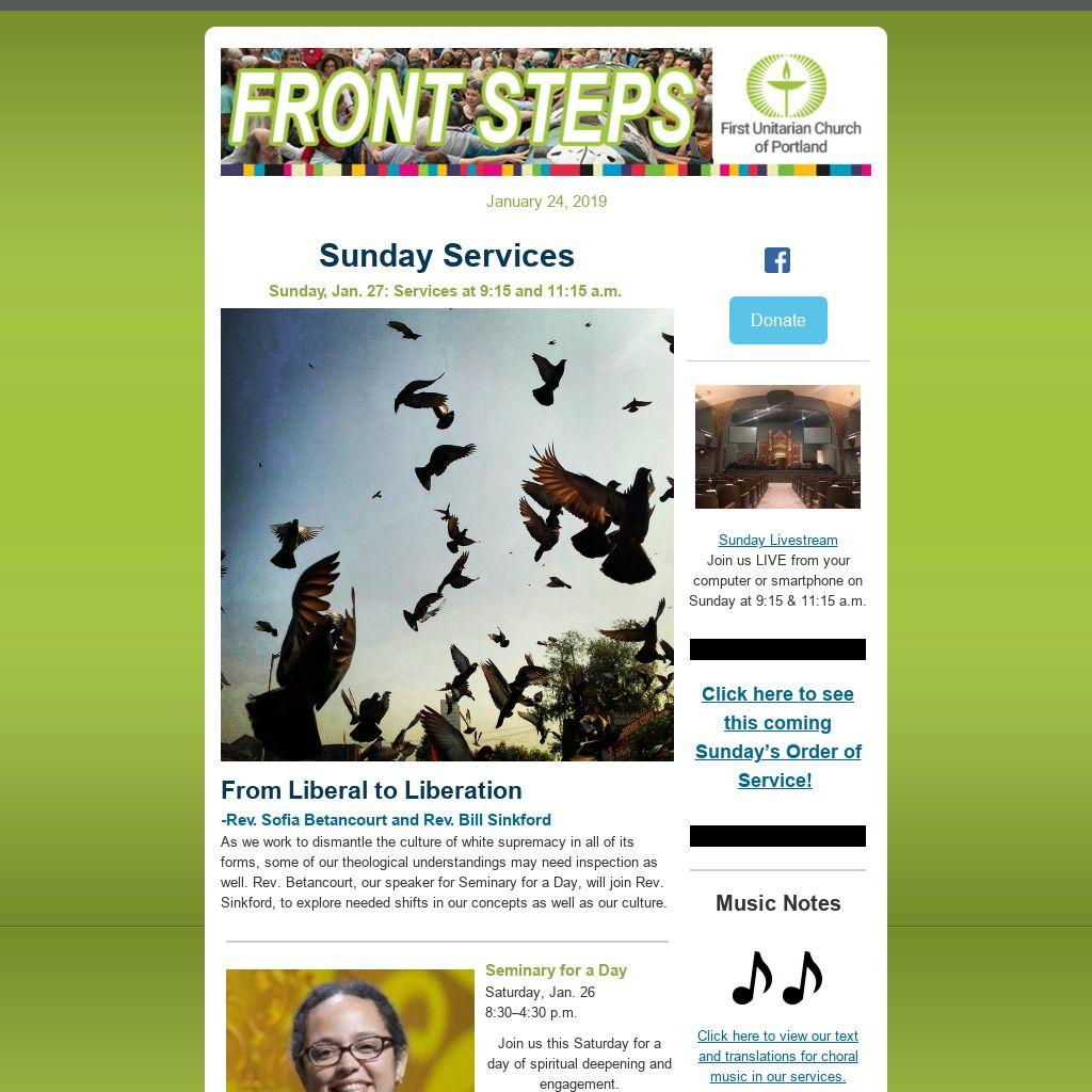 Do You Have an Item for E-news and/or the Sunday Bulletin?If you have an item you’d like published in our weekly Front Steps (eNews) or the Sunday Bulletin, please submit it to: