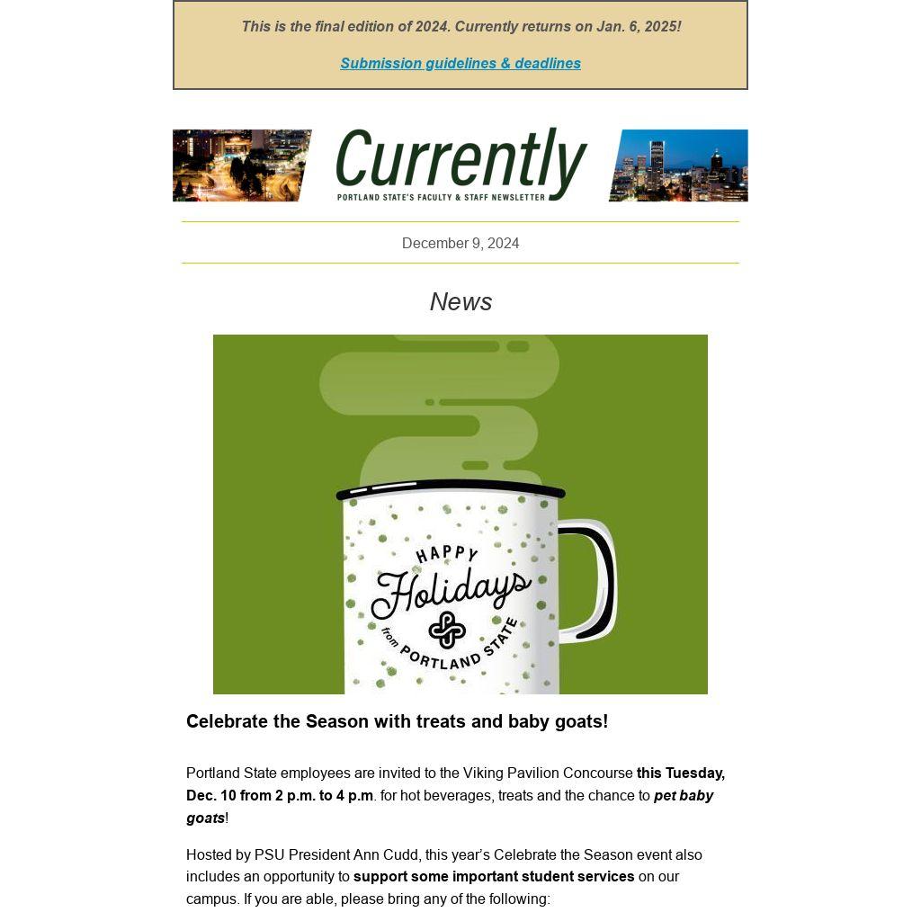 CURRENTLY is a weekly newsletter for the employees of Portland State University, published by University Communications. News items, events and accolades should be sent to currently@pdx.edu. Deadline is noon, the Tuesday before publication. See the Currently website for submission guidelines and schedule.