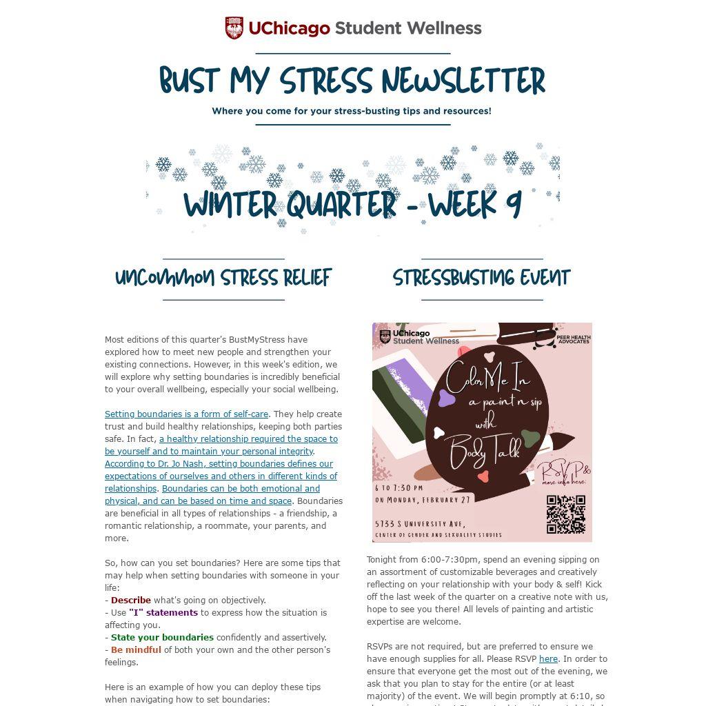 If you're struggling in setting boundaries or would like assistance navigating those conversations, there are multiple supports available to you through UChicago. UChicago Student Wellness offers both individual and couples therapy. The UChicago Center to Awareness, Resolution, Education, and Support (CARES) offers a variety of prevention education options and trainings and supports for students experiencing misconduct.