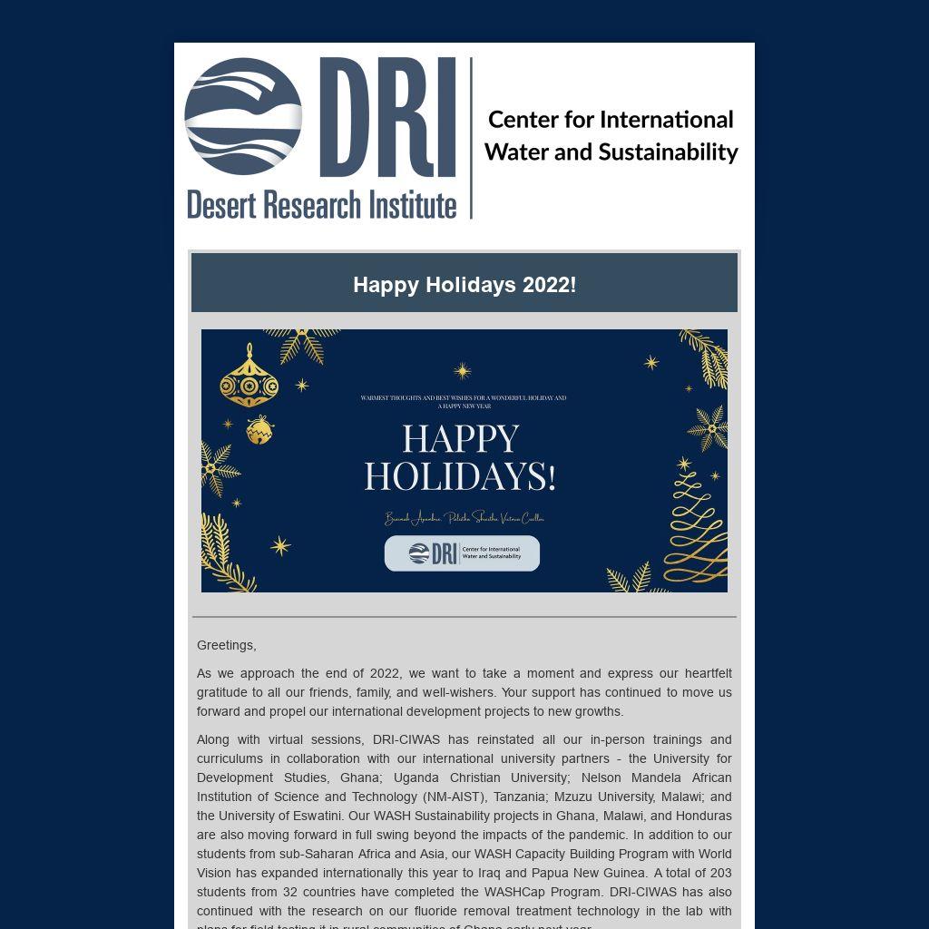 As we move into the holidays and begin a new year, we want to thank you for your financial support and collaboration with CIWAS. On behalf of everyone on the CIWAS team - Braimah, Victoria, Palistha, and all our supporting DRI faculty, best wishes to you and your families. Have a wonderful holiday season and Happy New Year 2023!