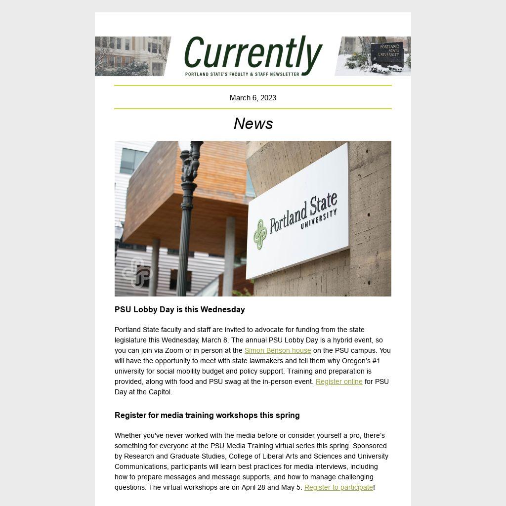 Currently is Portland State University’s weekly faculty and staff newsletter. It is published online every Monday during the academic year by University Communications. News items should be emailed by noon the Tuesday before publication. See the Currently websitefor submission guidelines and schedule.