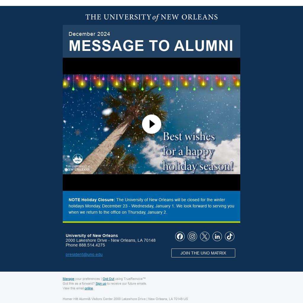 NOTE Holiday Closure: The University of New Orleans will be closed for the winter holidays Monday, December 23 - Wednesday, January 1. We look forward to serving you when we return to the office on Thursday, January 2.