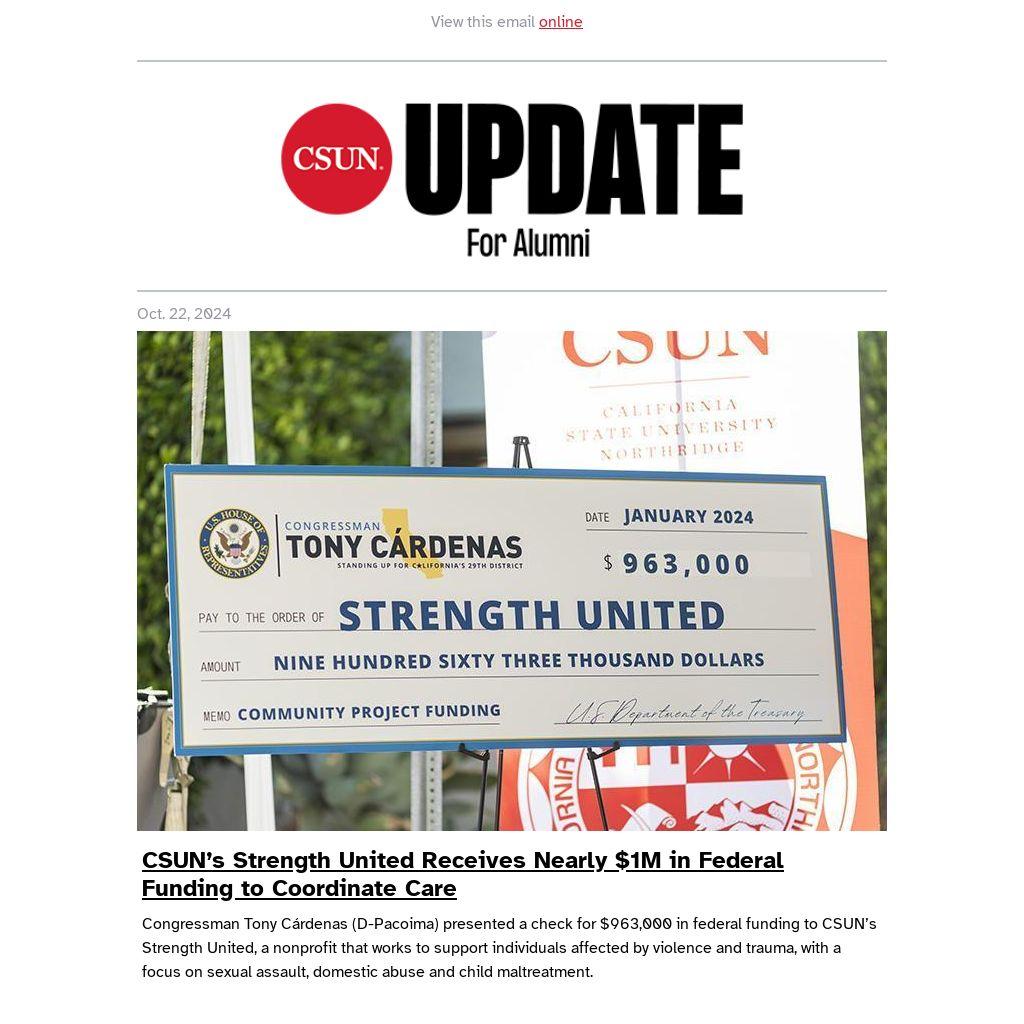 Congressman Tony Cárdenas (D-Pacoima) presented a check for $963,000 in federal funding to CSUN’s Strength United, a nonprofit that works to support individuals affected by violence and trauma, with a focus on sexual assault, domestic abuse and child maltreatment.