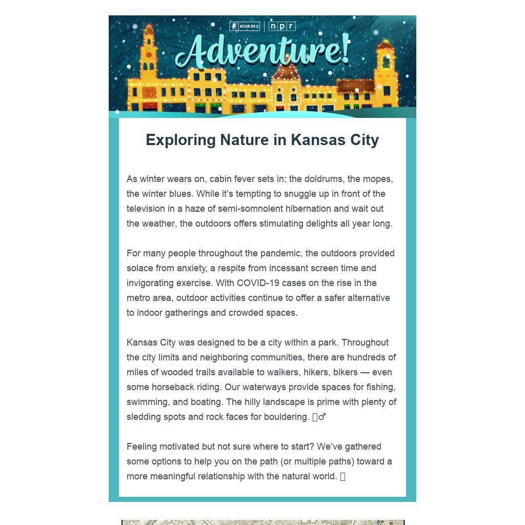 Early on in the pandemic, we featured hiking for our 39th adventure, with suggestions from KCUR staff. Based on her own pandemic-endeavors, KCUR’s Gina Kaufmann put together her recommendations with a beginner’s guide to hiking trails in Kansas City. But in her podcast Real Humans, she also examines how some of Kansas City’s parks weren’t really designed to serve all of Kansas City’s residents. 🎧
