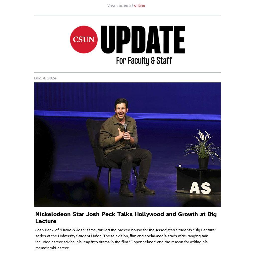 Josh Peck, of “Drake & Josh” fame, thrilled the packed house for the Associated Students “Big Lecture” series at the University Student Union. The television, film and social media star’s wide-ranging talk included career advice, his leap into drama in the film “Oppenheimer” and the reason for writing his memoir mid-career.