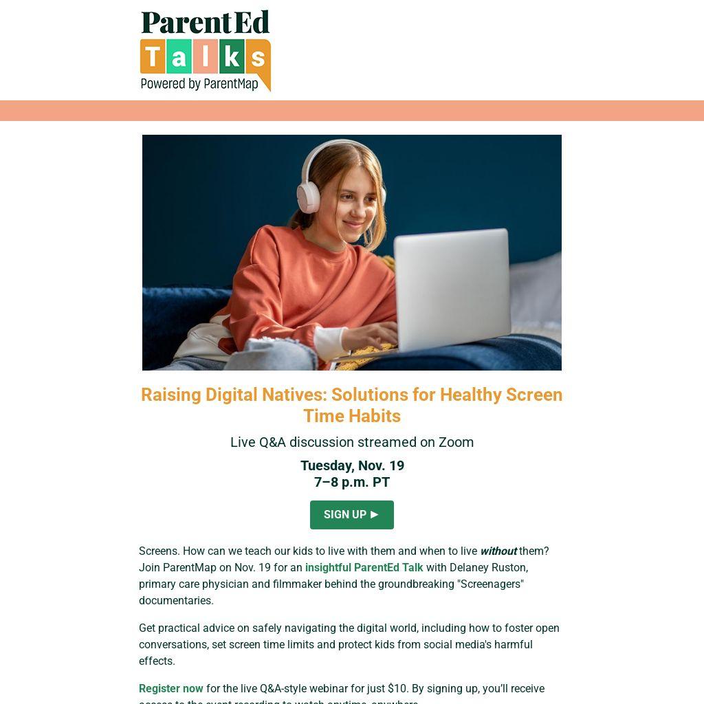 Screens. How can we teach our kids to live with them and when to live without them? Join ParentMap on Nov. 19 for an insightful ParentEd Talk with Delaney Ruston, primary care physician and filmmaker behind the groundbreaking "Screenagers" documentaries.
