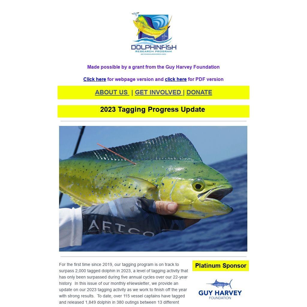 For the first time since 2019, our tagging program is on track to surpass 2,000 tagged dolphin in 2023, a level of tagging activity that has only been surpassed during five annual cycles over our 22-year history. In this issue of our monthly eNewsletter, we provide an update on our 2023 tagging activity as we work to finish off the year with strong results. To date, over 115 vessel captains have tagged and released 1,849 dolphin in 380 outings between 13 different countries in 2023. This effort has resulted in 23 new dolphin movements to bring our program's recapture database to 807 recoveries from 34,995 tagged fish! We strive to maintain detailed records of all tagged and recovered fish in order to allow us to advance scientific discovery for dolphin and showcase the results generated by our participants. Over the past five years, we have created several dedicated tagging pages for anglers that have generated superb results. Captain Bouncer