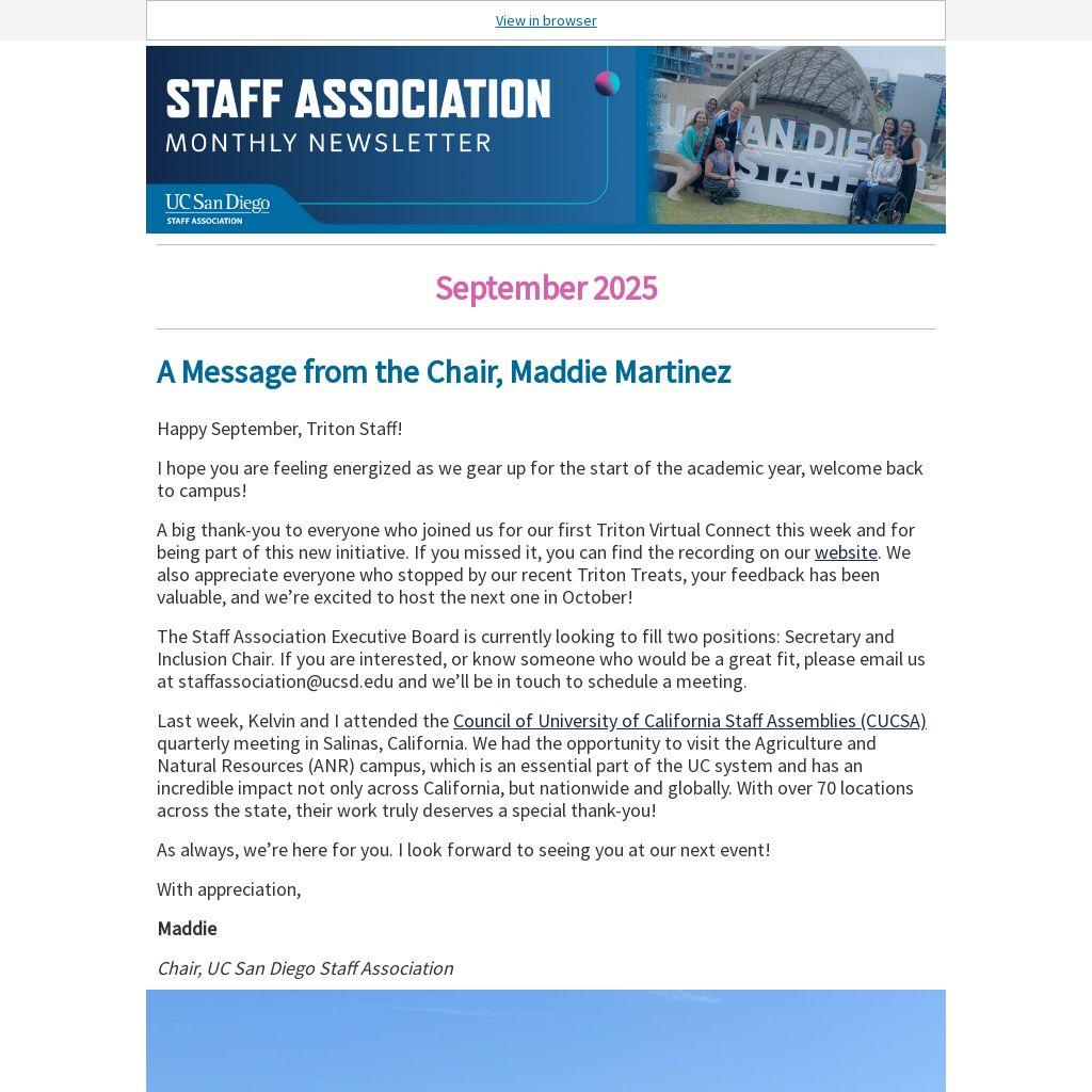 The Staff Association Executive Board is currently looking to fill two positions: Secretary and Inclusion Chair. If you are interested, or know someone who would be a great fit, please email us at staffassociation@ucsd.edu and we’ll be in touch to schedule a meeting.