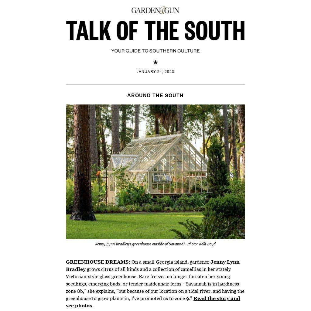 GREENHOUSE DREAMS: On a small Georgia island, gardener Jenny Lynn Bradley grows citrus of all kinds and a collection of camellias in her stately Victorian-style glass greenhouse. Rare freezes no longer threaten her young seedlings, emerging buds, or tender maidenhair ferns. “Savannah is in hardiness zone 8b,” she explains, “but because of our location on a tidal river, and having the greenhouse to grow plants in, I’ve promoted us to zone 9.” Read the story and see photos.