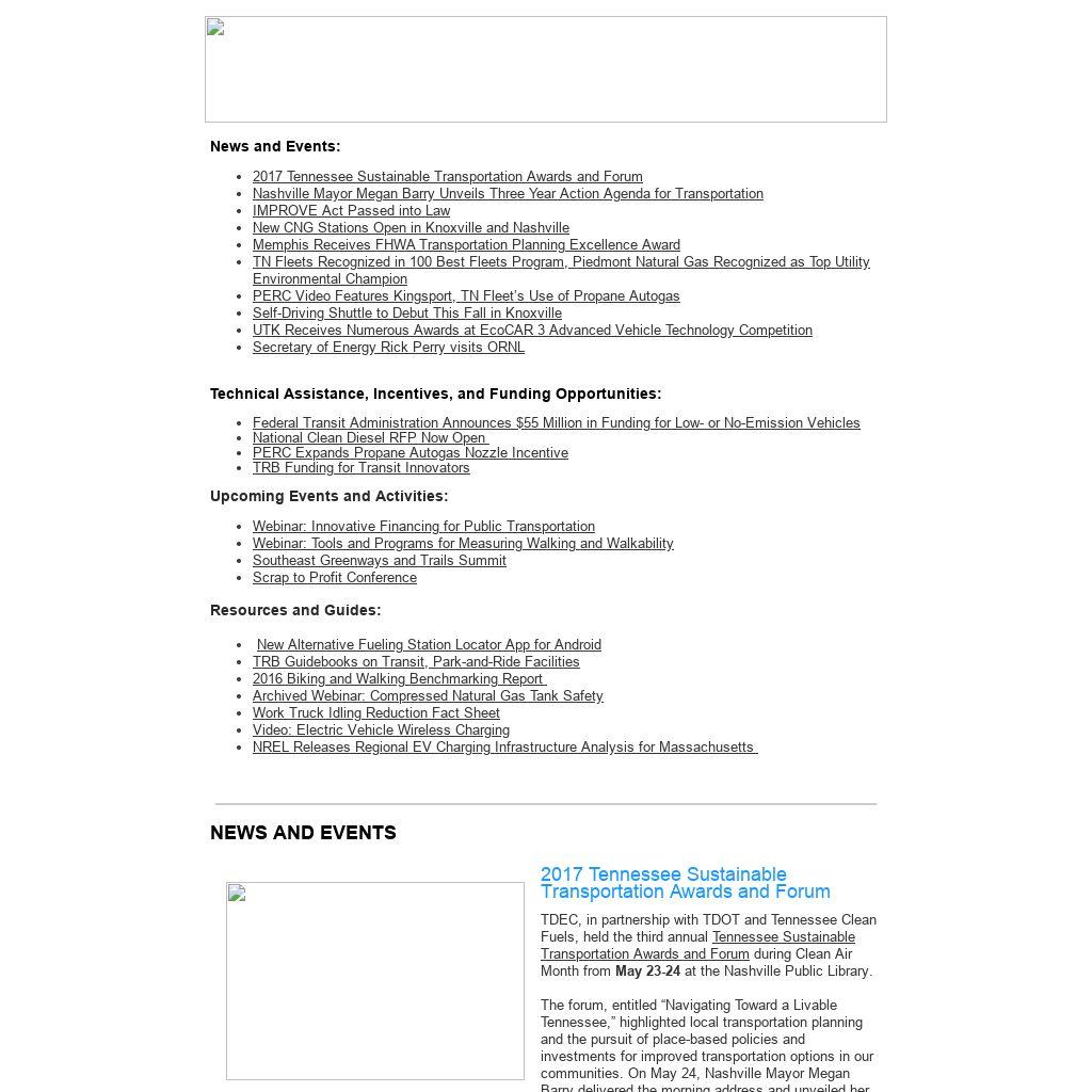 | 2017 Tennessee Sustainable Transportation Awards and Forum The forum, entitled “Navigating Toward a Livable Tennessee,” highlighted local transportation planning and the pursuit of place-based policies and investments for improved transportation options in our communities. On May 24, Nashville Mayor Megan Barry delivered the morning address and unveiled her three year action agenda for transportation. Also on May 24, TDEC and TDOT announced the winners of the 2017 Tennessee Sustainable Transportation Awards. The Awards recognize outstanding initiatives to improve the efficiency, accessibility, affordability, and sustainability of transportation systems in the state. A panel of judges selected the following entities as the 2017 winners of the Tennessee Sustainable Transportation Awards: - Chattanooga Area Regional Transportation Authority