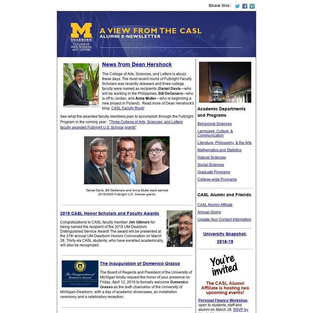 Congratulations to CASL faculty member Jim Gilmore for being named the recipient of the 2019 UM-Dearborn Distinguished Service Award! The award will be presented at the 37th annual UM-Dearborn Honors Convocation on March 26. Thirty-six CASL students, who have excelled academically, will also be recognized.