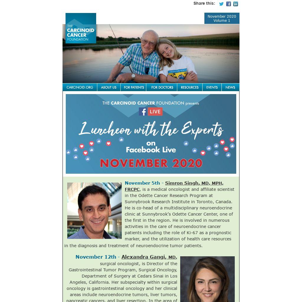 This Facebook LIVE event will be hosted by Rain Bennett, a longtime CCF filmmaker and dear friend of the NET community. To view the program come to CCF's Facebook page, https://www.facebook.com/Carcinoid/, at noon Eastern Time. There is no need to register and there is no special link.
