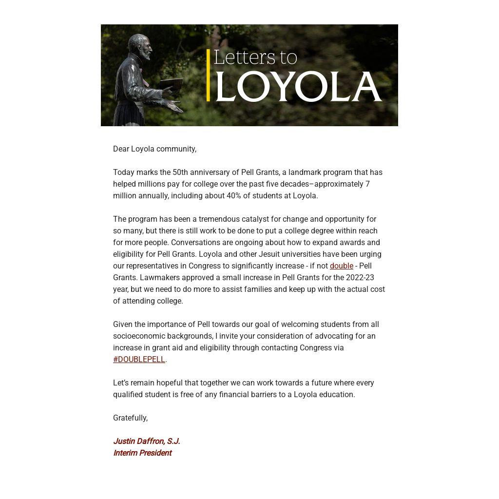 The program has been a tremendous catalyst for change and opportunity for so many, but there is still work to be done to put a college degree within reach for more people. Conversations are ongoing about how to expand awards and eligibility for Pell Grants. Loyola and other Jesuit universities have been urging our representatives in Congress to significantly increase - if not double - Pell Grants. Lawmakers approved a small increase in Pell Grants for the 2022-23 year, but we need to do more to assist families and keep up with the actual cost of attending college.