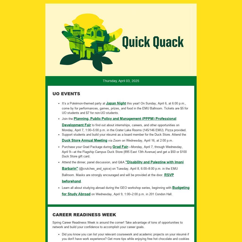 - Support students and build your résumé as a board member for the Duck Store. Attend the Duck Store Annual Meeting via Zoom on Wednesday, April 16, at 2:00 p.m.