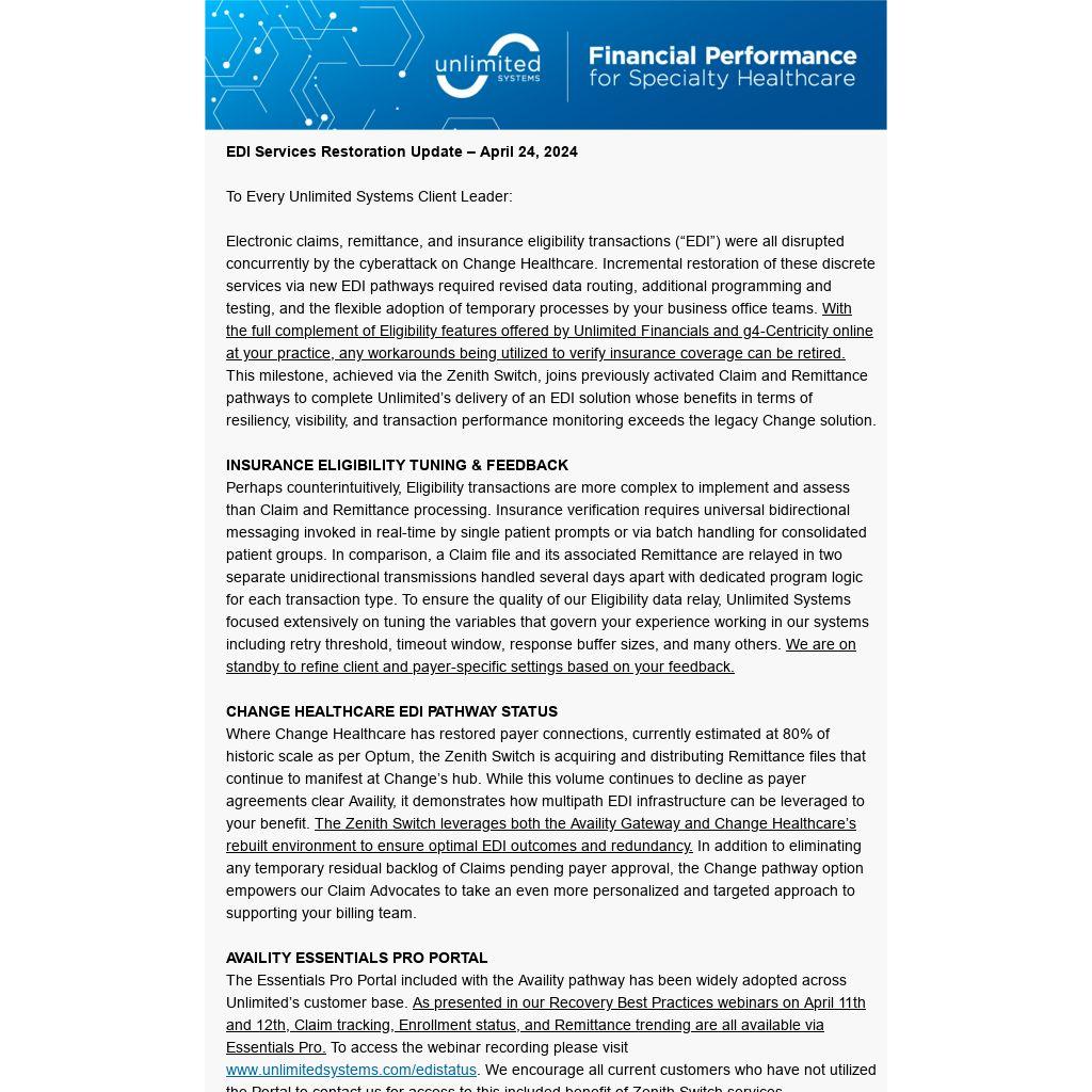 Electronic claims, remittance, and insurance eligibility transactions (“EDI”) were all disrupted concurrently by the cyberattack on Change Healthcare. Incremental restoration of these discrete services via new EDI pathways required revised data routing, additional programming and testing, and the flexible adoption of temporary processes by your business office teams. With the full complement of Eligibility features offered by Unlimited Financials and g4-Centricity online at your practice, any workarounds being utilized to verify insurance coverage can be retired. This milestone, achieved via the Zenith Switch, joins previously activated Claim and Remittance pathways to complete Unlimited’s delivery of an EDI solution whose benefits in terms of resiliency, visibility, and transaction performance monitoring exceeds the legacy Change solution.