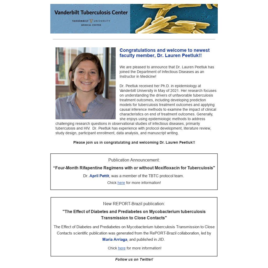 Dr. Peetluk received her Ph.D. in epidemiology at Vanderbilt University in May of 2021. Her research focuses on understanding the drivers of unfavorable tuberculosis treatment outcomes, including developing prediction models for tuberculosis treatment outcomes and applying causal inference methods to examine the impact of clinical characteristics on end of treatment outcomes. Generally, she enjoys using epidemiologic methods to address challenging research questions in observational studies of infectious diseases, primarily tuberculosis and HIV. Dr. Peetluk has experience with protocol development, literature review, study design, participant enrollment, data analysis, and manuscript writing.