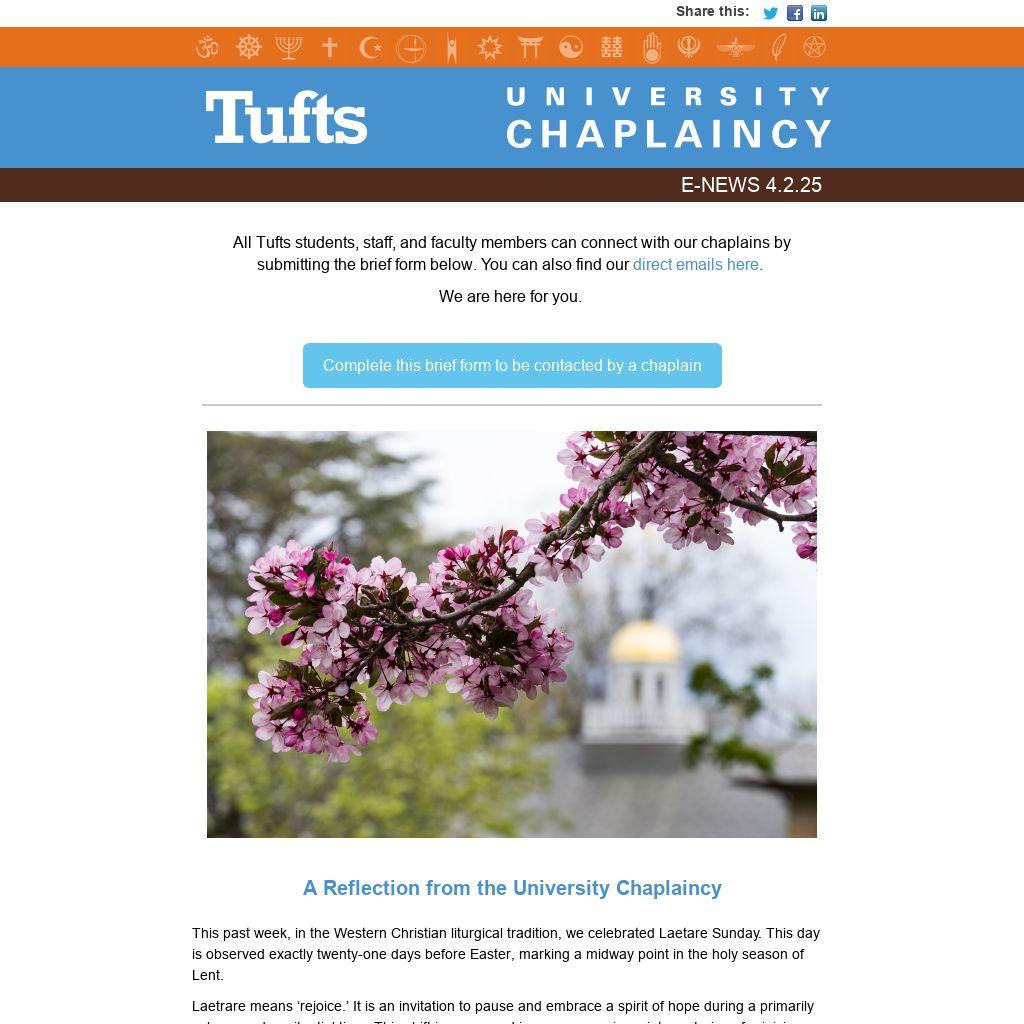 All Tufts students, staff, and faculty members can connect with our chaplains by submitting the brief form below. You can also find our direct emails here.