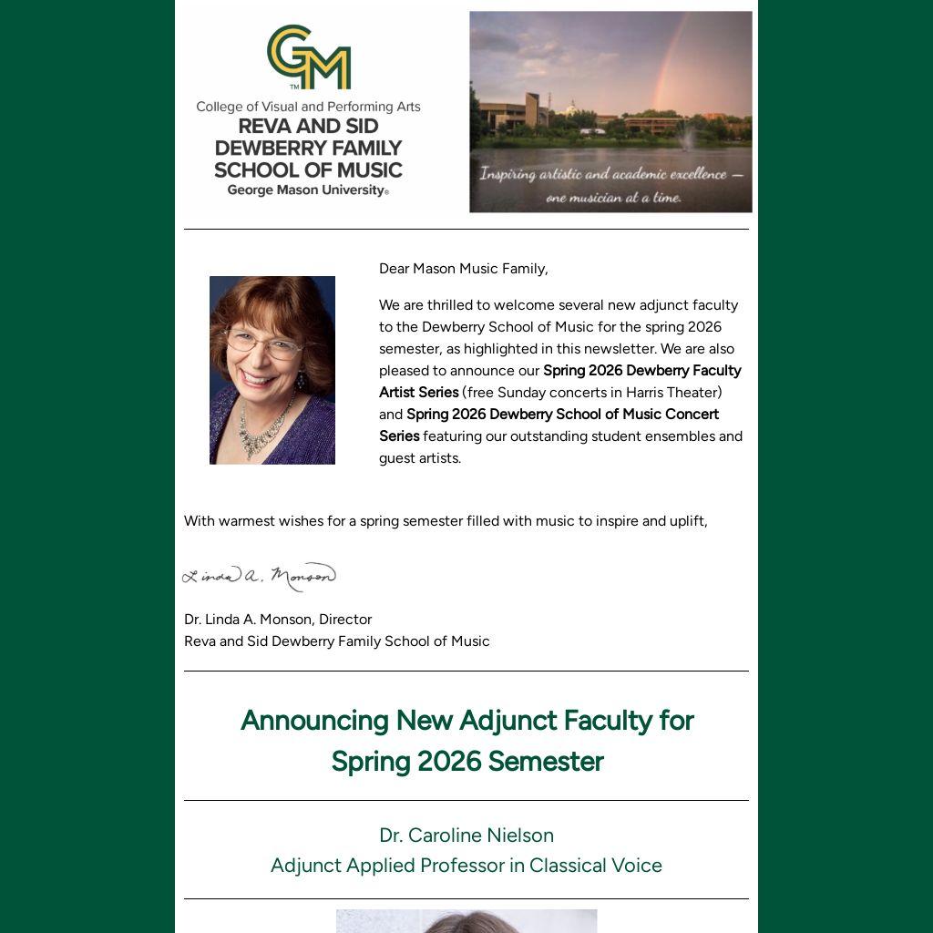 We are thrilled to welcome several new adjunct faculty to the Dewberry School of Music for the spring 2026 semester, as highlighted in this newsletter. We are also pleased to announce our Spring 2026 Dewberry Faculty Artist Series (free Sunday concerts in Harris Theater) and Spring 2026 Dewberry School of Music Concert Series featuring our outstanding student ensembles and guest artists.