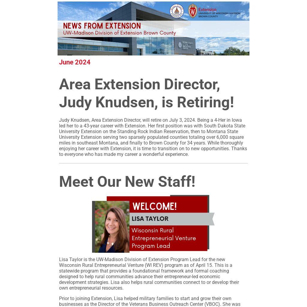 Judy Knudsen, Area Extension Director, will retire on July 3, 2024. Being a 4-Her in Iowa led her to a 43-year career with Extension. Her first position was with South Dakota State University Extension on the Standing Rock Indian Reservation, then to Montana State University Extension serving two sparsely populated counties totaling over 6,000 square miles in southeast Montana, and finally to Brown County for 34 years. While thoroughly enjoying her career with Extension, it is time to transition on to new opportunities. Thanks to everyone who has made my career a wonderful experience.