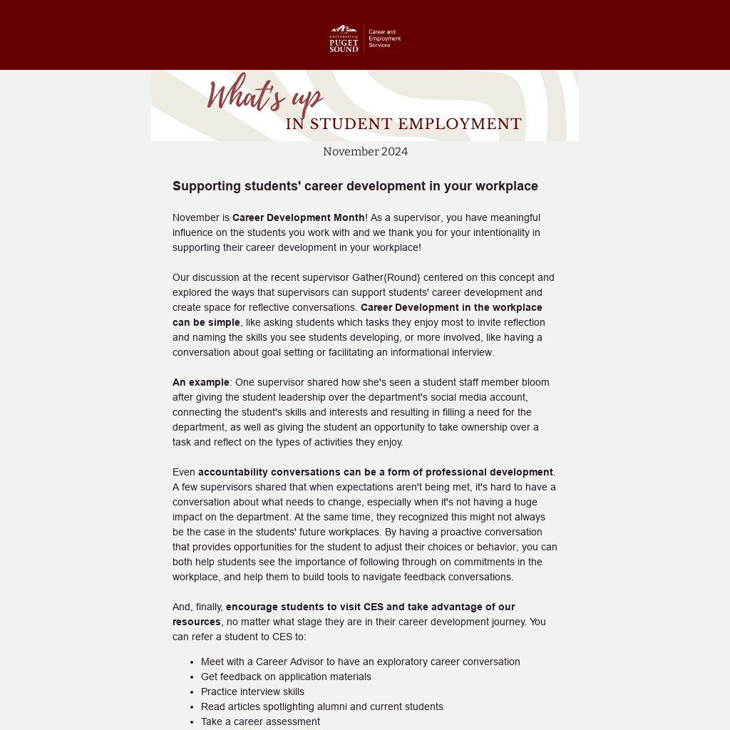 November is Career Development Month! As a supervisor, you have meaningful influence on the students you work with and we thank you for your intentionality in supporting their career development in your workplace!