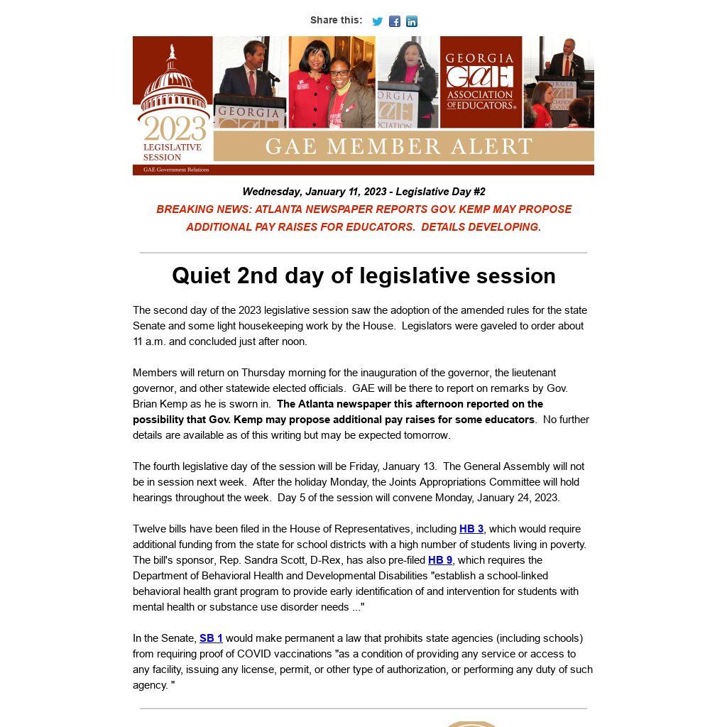 Members will return on Thursday morning for the inauguration of the governor, the lieutenant governor, and other statewide elected officials. GAE will be there to report on remarks by Gov. Brian Kemp as he is sworn in. The Atlanta newspaper this afternoon reported on the possibility that Gov. Kemp may propose additional pay raises for some educators. No further details are available as of this writing but may be expected tomorrow.