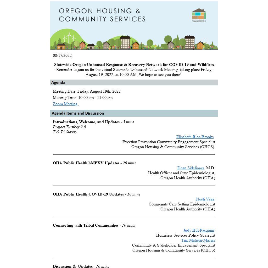 Reminder to join us for the virtual Statewide Unhoused Network Meeting, taking place Friday, August 19, 2022, at 10:00 AM. We hope to see you there!