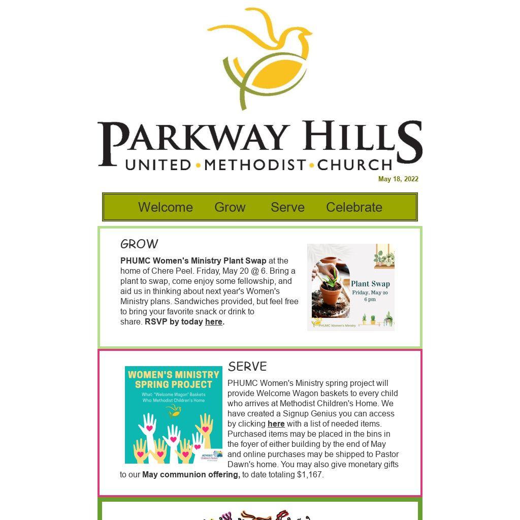 PHUMC Women's Ministry spring project will provide Welcome Wagon baskets to every child who arrives at Methodist Children's Home. We have created a Signup Genius you can access by clicking here with a list of needed items. Purchased items may be placed in the bins in the foyer of either building by the end of May and online purchases may be shipped to Pastor Dawn's home. You may also give monetary gifts to our May communion offering, to date totaling $1,167.