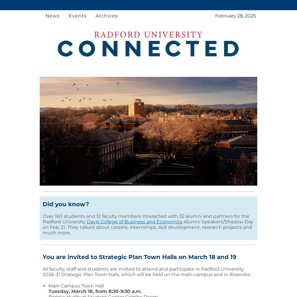 All faculty, staff and students are invited to attend and participate in Radford University 2026-31 Strategic Plan Town Halls, which will be held on the main campus and in Roanoke.
