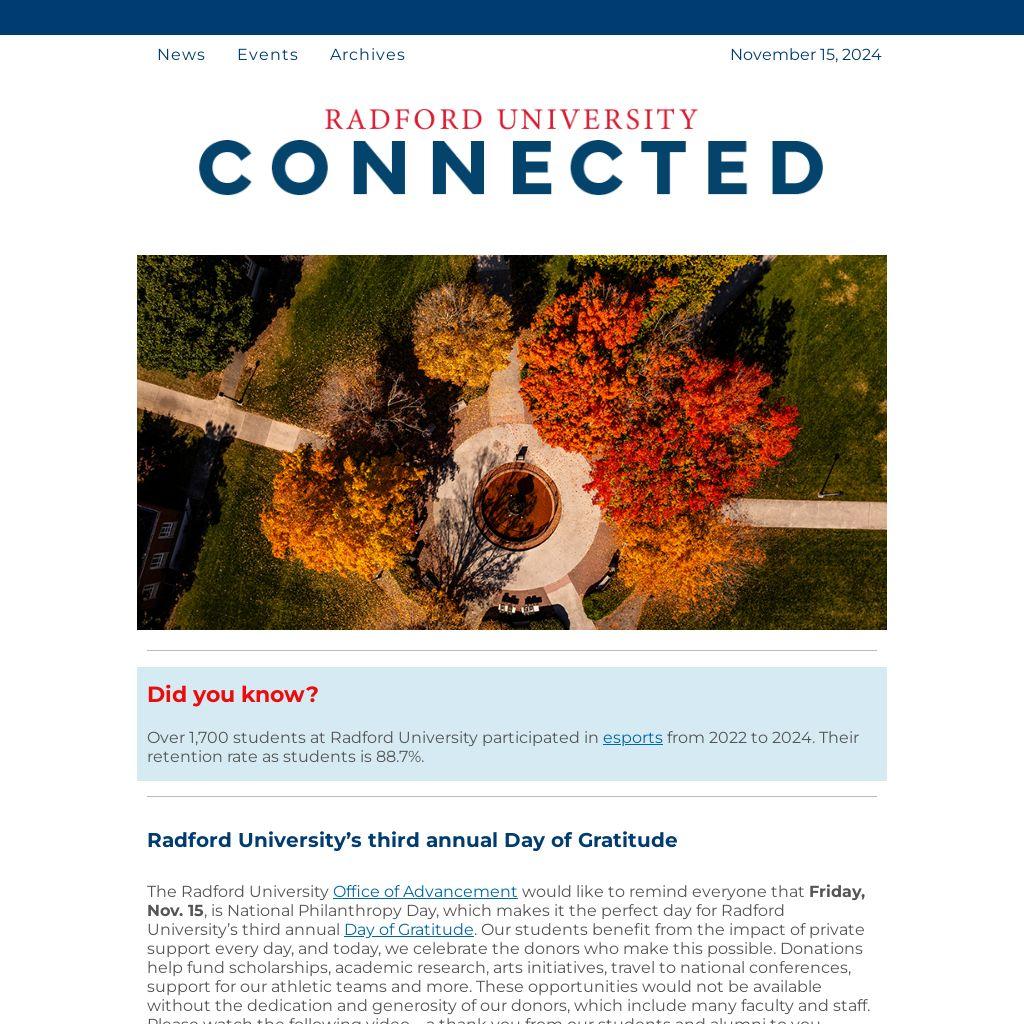 The Radford University Office of Advancement would like to remind everyone that Friday, Nov. 15, is National Philanthropy Day, which makes it the perfect day for Radford University’s third annual Day of Gratitude. Our students benefit from the impact of private support every day, and today, we celebrate the donors who make this possible. Donations help fund scholarships, academic research, arts initiatives, travel to national conferences, support for our athletic teams and more. These opportunities would not be available without the dedication and generosity of our donors, which include many faculty and staff. Please watch the following video – a thank you from our students and alumni to you.