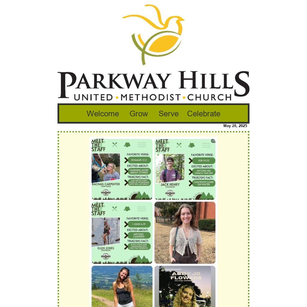 Parkway Hills has six college students serving as camp counselors this summer (that we know of!). We are proud of the ways these young people are reaching out to serve and be a part of ministry in other locations, and we give thanks for the formation they were given at Parkway Hills. Our work matters! Please hold them in prayer, and if you want to send them a note of encouragement, you can drop a card off at the office by Sunday, June 8 and we will add it to a Parkway Hills package, or feel free to send your own mailing if you so choose.