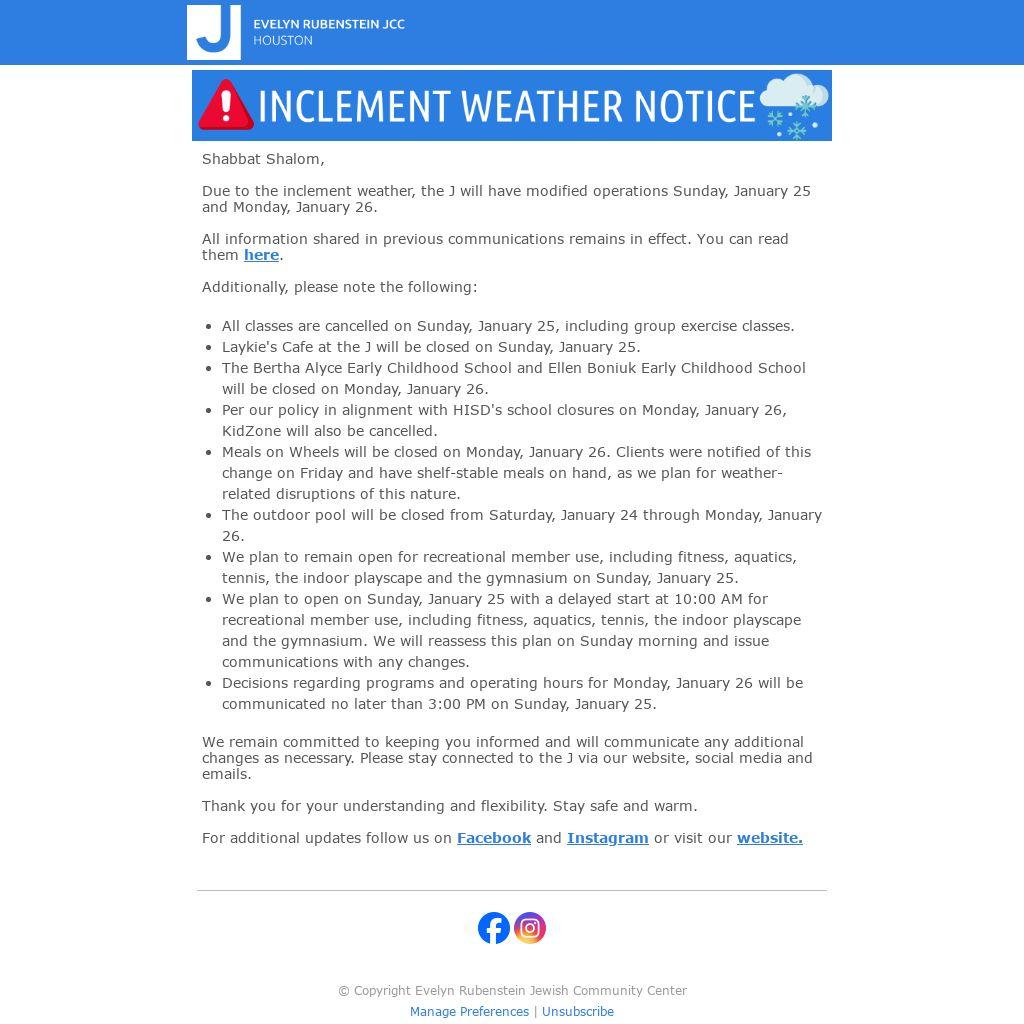 - Decisions regarding programs and operating hours for Monday, January 26 will be communicated no later than 3:00 PM on Sunday, January 25.