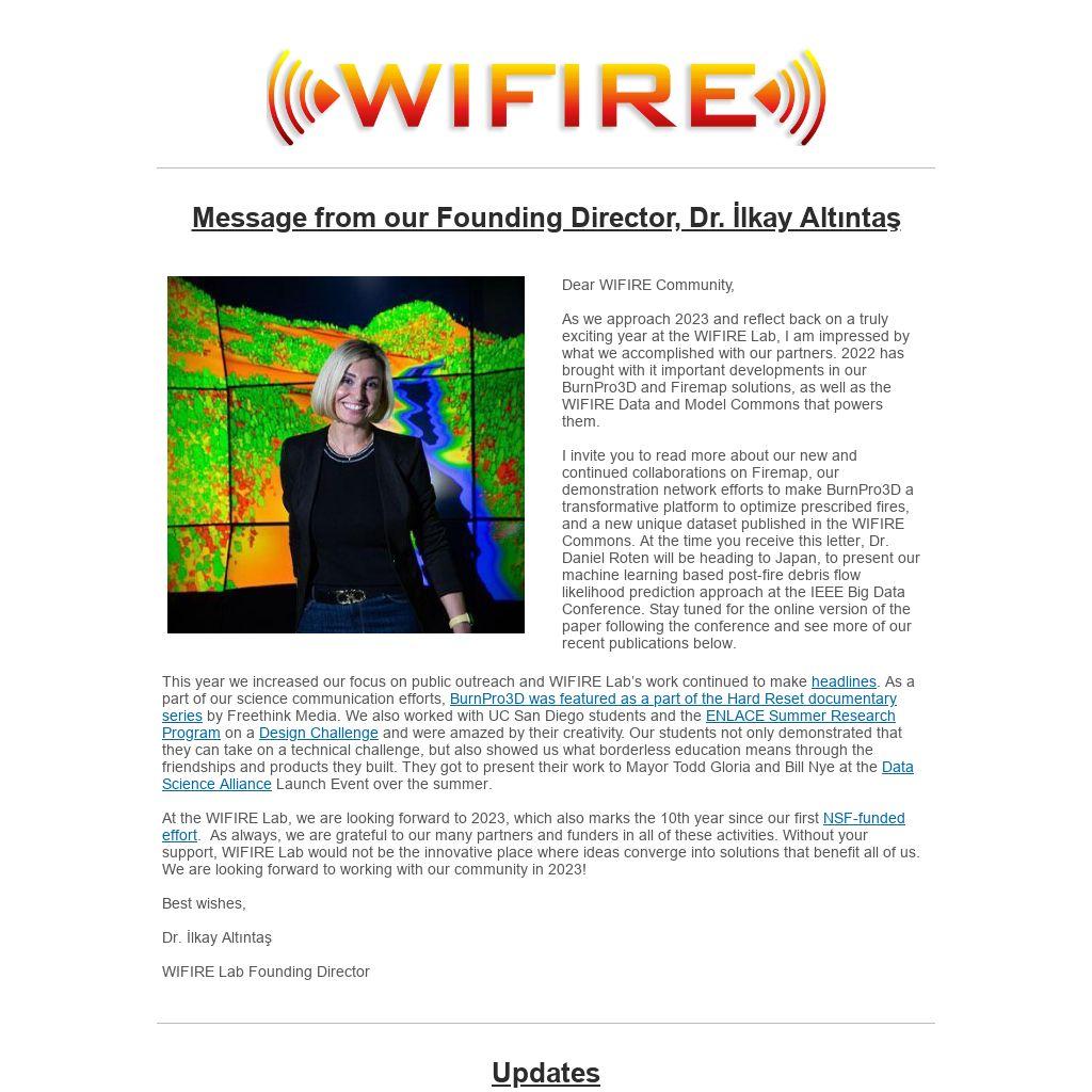At the WIFIRE Lab, we are looking forward to 2023, which also marks the 10th year since our first NSF-funded effort. As always, we are grateful to our many partners and funders in all of these activities. Without your support, WIFIRE Lab would not be the innovative place where ideas converge into solutions that benefit all of us. We are looking forward to working with our community in 2023!